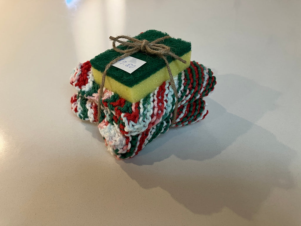 Two hand knitted dish cloths and a pot scrubber. Ideal for students setting up their own kitchen.