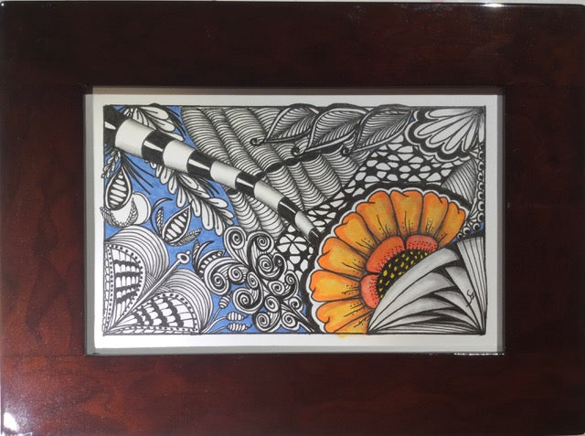 Original ink and alcohol marker on paper. Bold linework and intricate patterns weave around a single orange gerbera, half-concealed yet luminous against a field of abstract textures. This piece balances whimsy and elegance, drawing the eye to its quiet burst of colour.