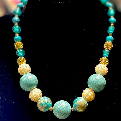 This radiant design features turquoise crackle beads, pearl-toned clusters, and shimmering gold accents that evoke the glow of a golden sunset. A perfect statement piece that brings elegance and warmth to any outfit.
