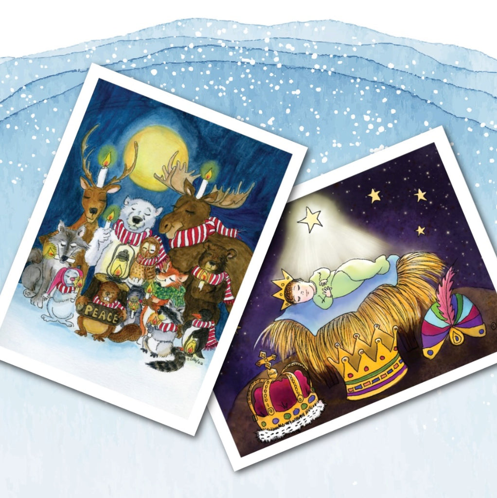 Features charming forest animals holding candles and spreading a message of peace and goodwill.