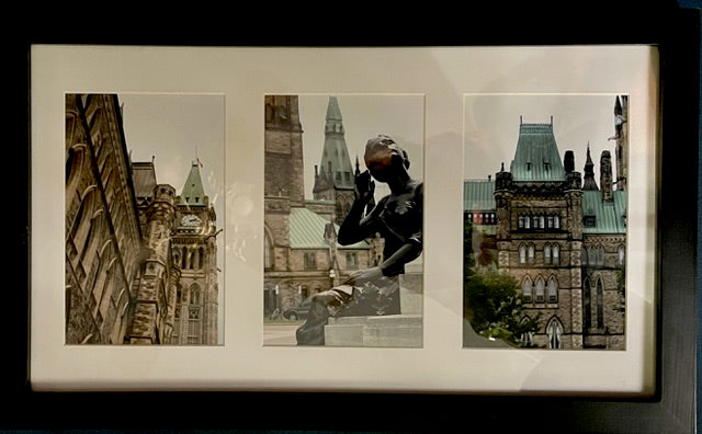 Framed photographic triptych featuring three complementary views of Ottawa’s Parliament buildings, including a central composition with the “Women are Persons” statue. The set highlights the iconic copper roofs, stonework, and sculptural details that define the city’s historic core. A refined piece for anyone who loves Ottawa’s architectural character.