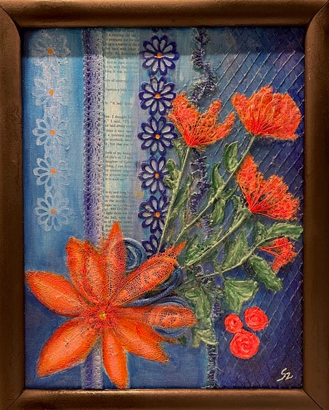 Mixed media with acrylic on canvas. Inspired by the quiet poetry of nature, this piece transforms humble elements — wild carrot seeds and a tomatillo seed pod — into radiant blooms. Textured layers of paint, fibre, and text evoke the final flourish of the garden before winter’s rest, celebrating the beauty found in nature’s cycles of change and renewal.
