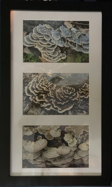 Framed photographic triptych featuring three close-up studies of tree fungi found in the local woods. Each image highlights the sculptural, layered forms and subtle colour shifts of these natural growths — from soft greys and blues to warm earthy tones. A calming, organic piece that celebrates the beauty of overlooked forest textures.